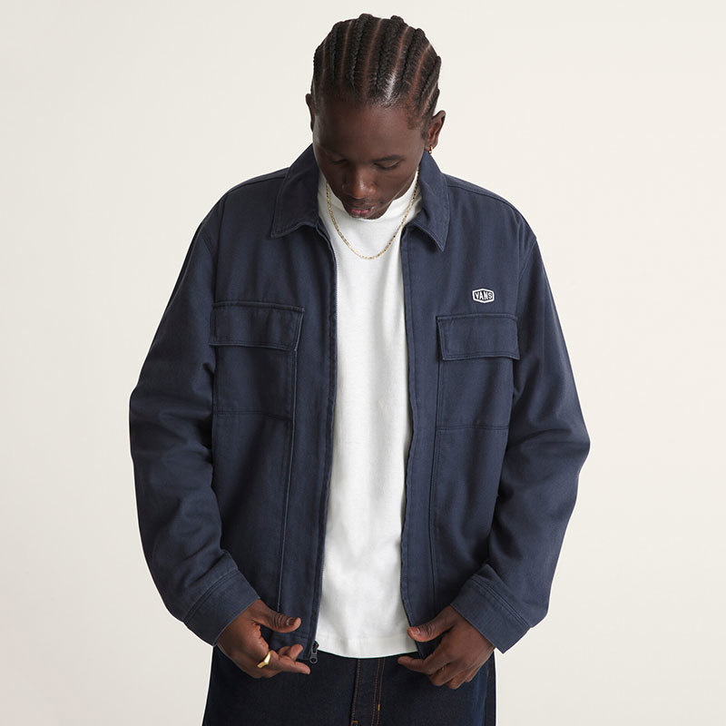 La campera McAvoy Zip Station Jacket color azul Parisian Night está confeccionada en sarga de algodón de peso medio y presenta un diseño funcional con cierre frontal oculto. Incluye bolsillos de parche con solapa y cierres a presión ocultos, además de bolsillos laterales abiertos para mayor practicidad. El diseño se completa con una etiqueta tejida Vans® en el dobladillo, sumando un toque distintivo a esta prenda urbana y versátil hecha en 100% algodón.