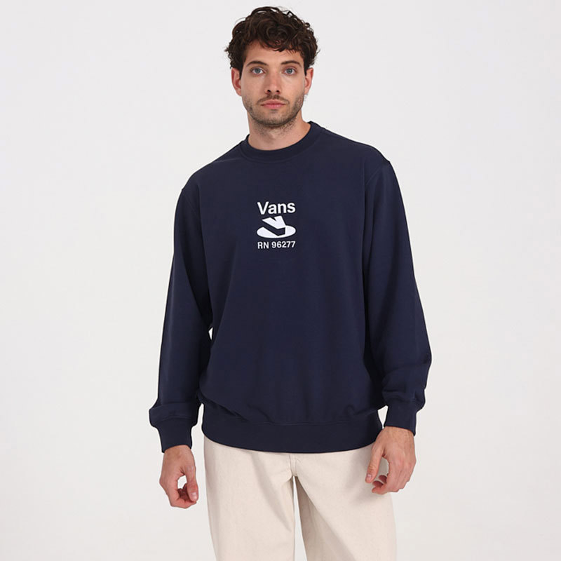 El buzo Elevated Crew color Azul Parisian Night eleva la silueta clásica de cuello redondo con un diseño holgado y un bordado destacado en el frente. Confeccionado en un tejido suave de algodón y poliéster, incorpora etiqueta de marca y talle en el interior, y grifa lateral distintiva de Vans. Composición: 70% algodón, 30% poliéster.