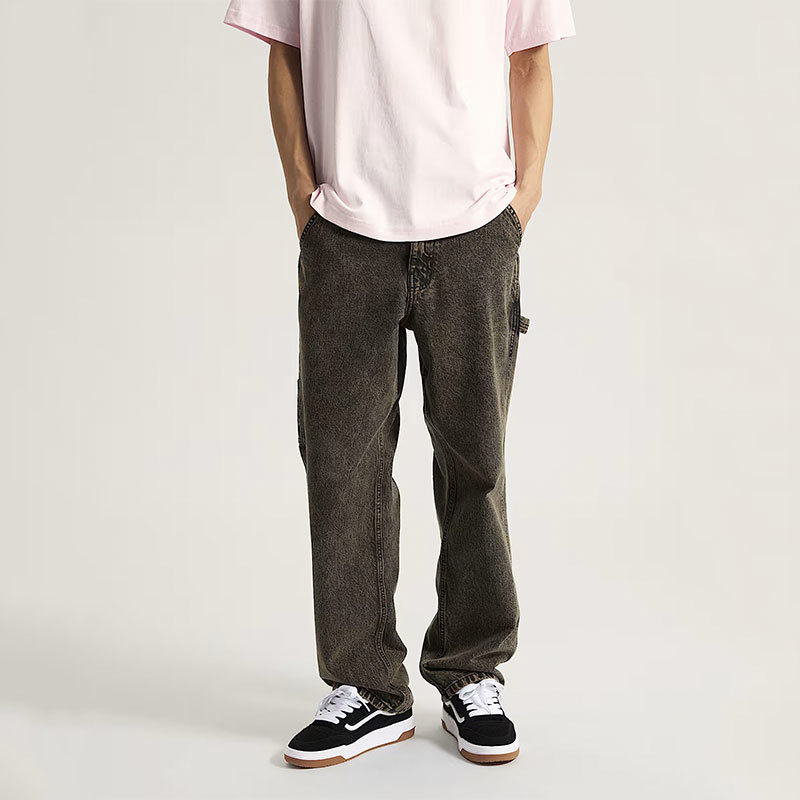 El pantalón Drill Chore Carpenter color verde bay leaf combina el estilo relajado con la funcionalidad clásica de los pantalones de carpintero. Confeccionado en lona de algodón de gramaje medio con un acabado lavado y efecto desgastado, presenta un corte holgado y bajos amplios de 47 cm para una mayor libertad de movimiento. Incluye bolsillos frontales diagonales, bolsillo monedero, bolsillos traseros con trabilla para martillo, bolsillo portaherramientas y una trabilla en forma de “V” en la parte trasera de la cintura. Un detalle distintivo es la etiqueta interna con logo, visible al doblar el bajo. Composición: 100% algodón.