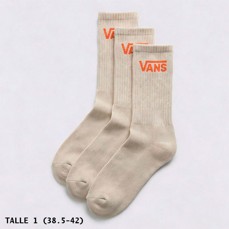 Media VANS original Classic Crew Tripack beige de caña alta, ideal para sumar comodidad y un estilo clásico al uso diario. Presenta logo VANS en jacquard que aporta un detalle distintivo y reconocible. Está confeccionada con una mezcla de 76% algodón, 11% spandex, 9% poliamida y 4% elastómero, que brinda suavidad, elasticidad y buena durabilidad. El pack de tres pares resulta práctico para completar distintos looks de todos los días con un calce cómodo y versátil.