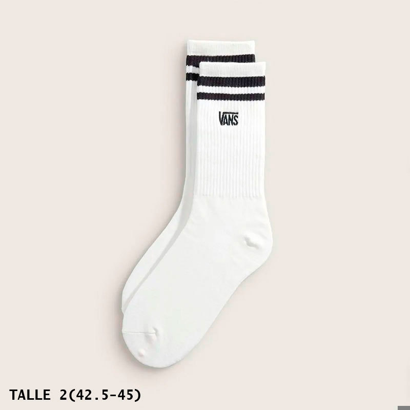 Medias VANS original Stretch Logo Crew Blanco de caña media, confeccionadas con mezcla de 66% algodón, 27% poliéster, 3% elastodieno, 2% nailon y 2% elastano. Su tejido elástico acompaña el movimiento con un ajuste cómodo para el uso diario, mientras que la suela acolchada ayuda a absorber el impacto en jornadas largas. Las rayas jacquard y el logotipo VANS bordado aportan una estética deportiva y limpia, ideal para completar un look urbano.