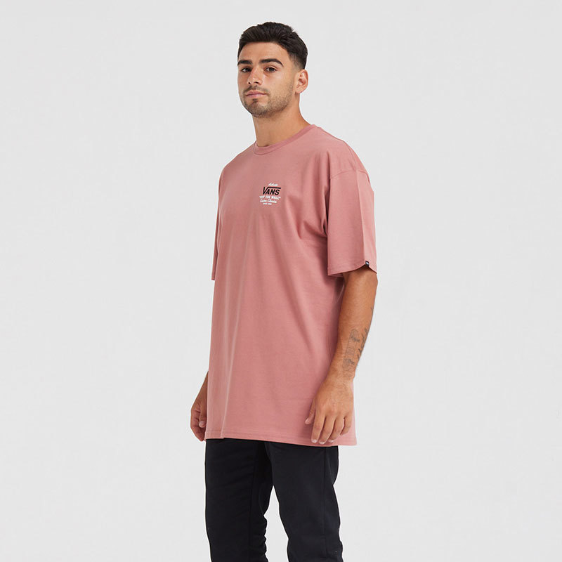 La remera Holder Classic de Vans destaca tanto por su diseño de manga corta y cuello redondo y cardado, como por sus gráficos «Off the Wall» de estilo retro, dispuestos tanto en el lado izquierdo del pecho y en la espalda.